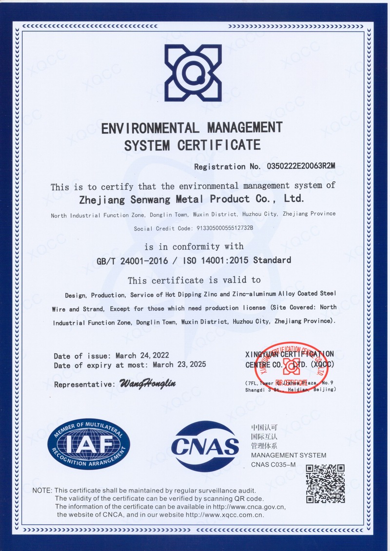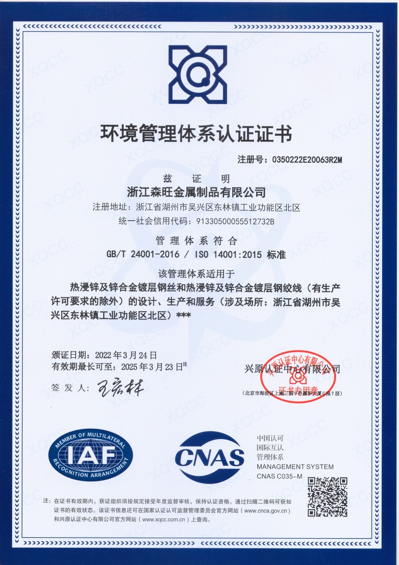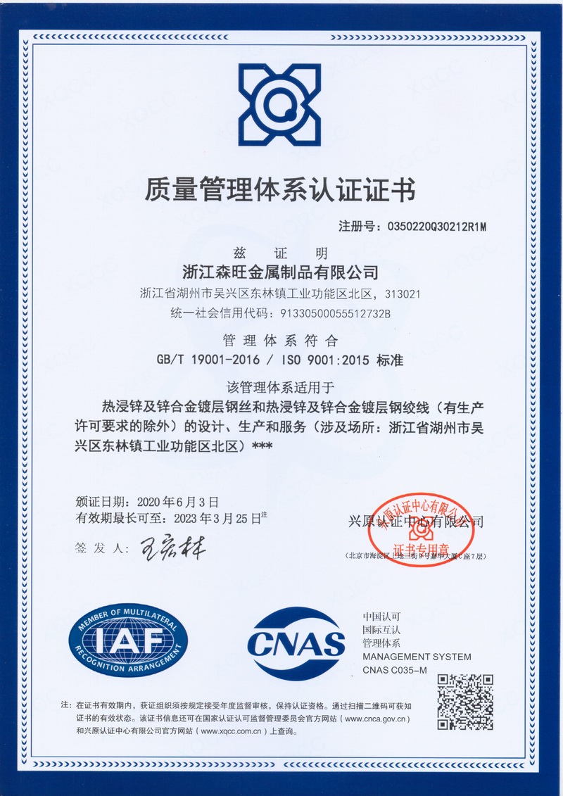 浙江森旺金屬制品有限公司成立于2012年,坐落湖州市吳興區東林鎮工業功能區。公司專業從事各類鍍鋅鋼絲、鋼絞線等產品的開發及生產。目前產品已廣泛應用于各類通信光電纜,電力輸送,電氣化鐵路工程,各類堤壩防護及農業溫室等工程領域。公司秉承“追求卓越品質,創建卓著信譽”的經營理念,始終堅持專業化、規?;慕洜I模式。